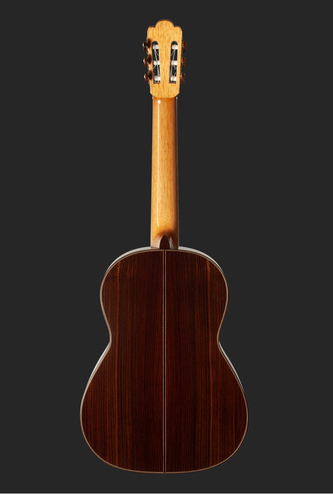 しっかりと厚い表板に、駒裏部分に薄い補強板を付ける等の特徴ある構造がもたらす、透明で色彩感のあるハウザー1世モデル、独特の粘りを持った硬質な響き、透徹としてしかし繊細極まりない音色。モダンギター的な音量の増幅よりも、音響の透徹を極めることにより最弱音でも非常な遠達性を備え、結果それが指先の微細なタッチの変化にも対応しうる自在な表現力をも達成しています。重厚な低音と引き締まった高音、バランス良く和音の分離に良く遠達性に優れた、巨匠セゴビアが演奏したハウザーの響きを体現した楽器です。