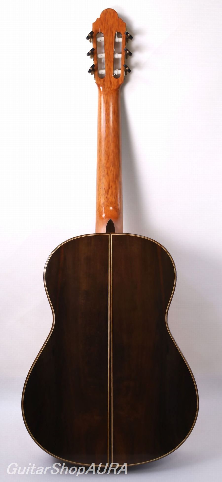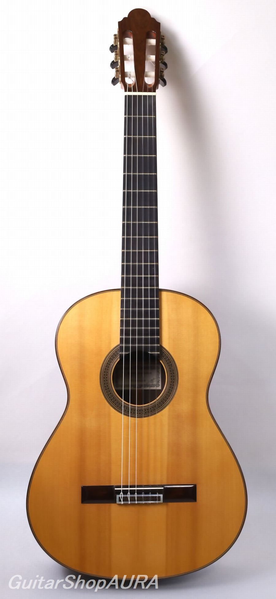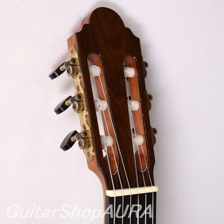 Finished entirely in shellac, and fitted with Rubner tuning machines. The neck is straight and offers very good playability, with virtually no fret wear. String height is set relatively low at 2.3 mm on the 1st string and 3.3 mm on the 6th string, and approximately 1.5 mm of saddle height remains, allowing for future adjustment if desired. String tension feels relatively light, and the neck profile is of a standard, comfortable shape, making the guitar easy to play.