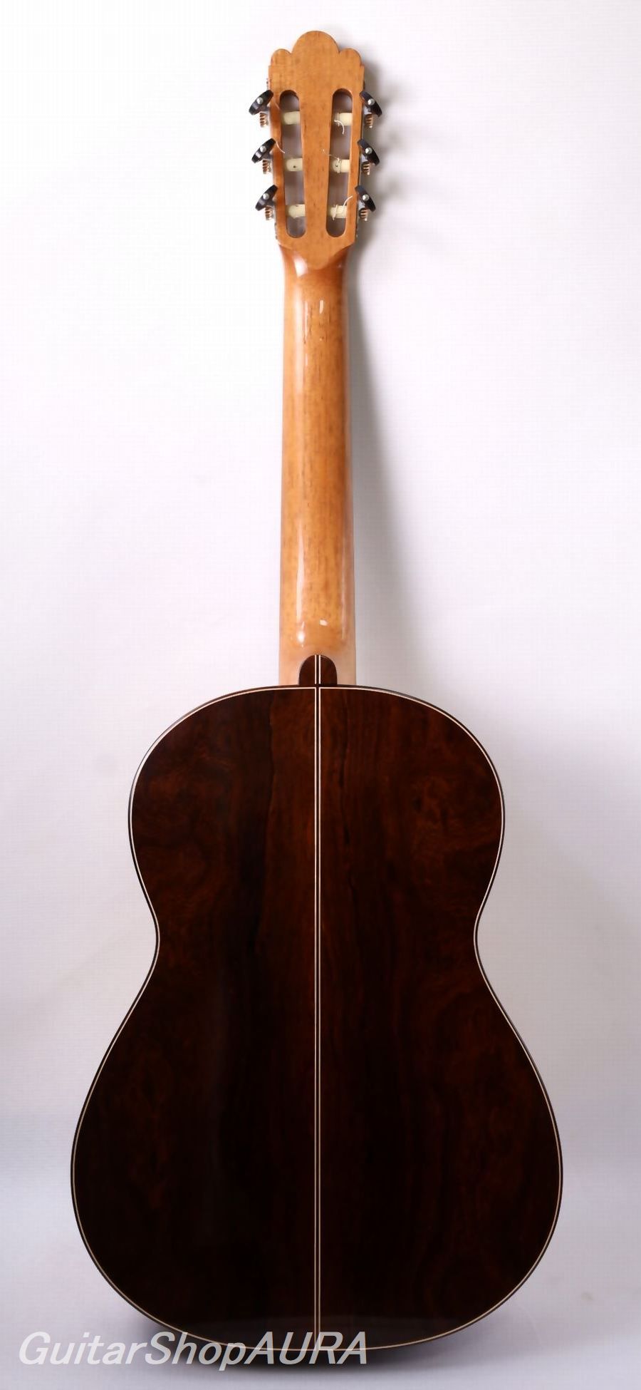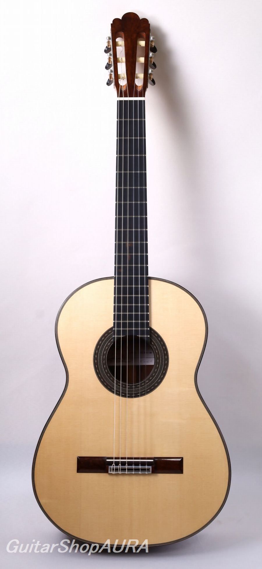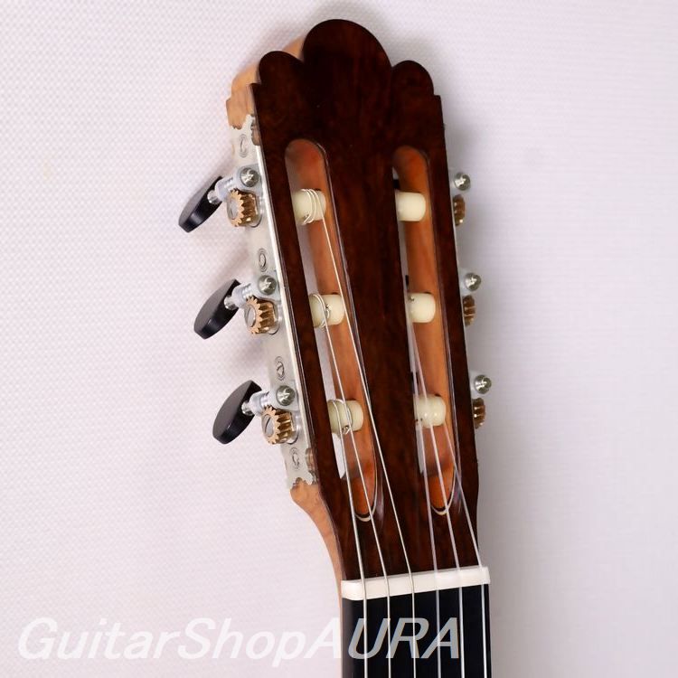 The top is a visually striking, subtly figured spruce, paired with delicate, natural Madagascar rosewood back and sides. The bold, black-based rosette is intricately detailed. The headstock follows Torres–Garcia styling, exuding classical elegance. Scale length is 640mm; the neck is a rounded D-shape for a comfortable, compact grip. String action is 3.0/4.0mm (1st/6th string at the 12th fret, with 1.0–1.5mm saddle compensation), with slightly higher string tension. Tuners are the premium Italian Alessi Garcia Special model. The guitar is finished in beautiful shellac.