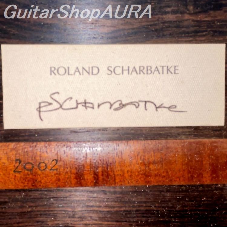 We present a used Roland Scharbatke guitar made in 2002. The top bracing features two harmonic bars (one long, one short) above the soundhole on the neck side, and a single harmonic bar below on the bridge side. On each side of the soundhole (treble and bass sides), two short braces cross in an X pattern, covering the area divided by the harmonic bars. The lower bout employs seven symmetrically arranged fan braces: the center three are placed nearly parallel and close together, spanning roughly the width of the soundhole diameter, while the other four fan outwards. Unlike standard designs where two V-shaped bars support these braces at the bottom, here a single transverse bar supports the brace tips, with an additional short bar near the end block.