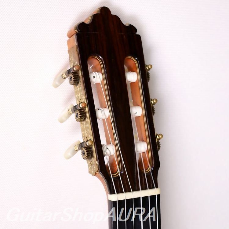 The top features parallel braces with a diagonal treble-side brace, two inverted “V” closing bars at the bottom, and a thin reinforcement plate under the bridge. Resonance is set between F# and G. Despite minor superficial scratches and carefully repaired cracks, the guitar is structurally sound. The neck is a thin D-shape with a compact, comfortable grip. String height is 3.1 mm (treble) / 4.0 mm (bass) at the 12th fret, with 1–2 mm of saddle surplus, offering excellent playability. The tuners were replaced with high-quality Rodgers tuners from Canada and remain fully functional.