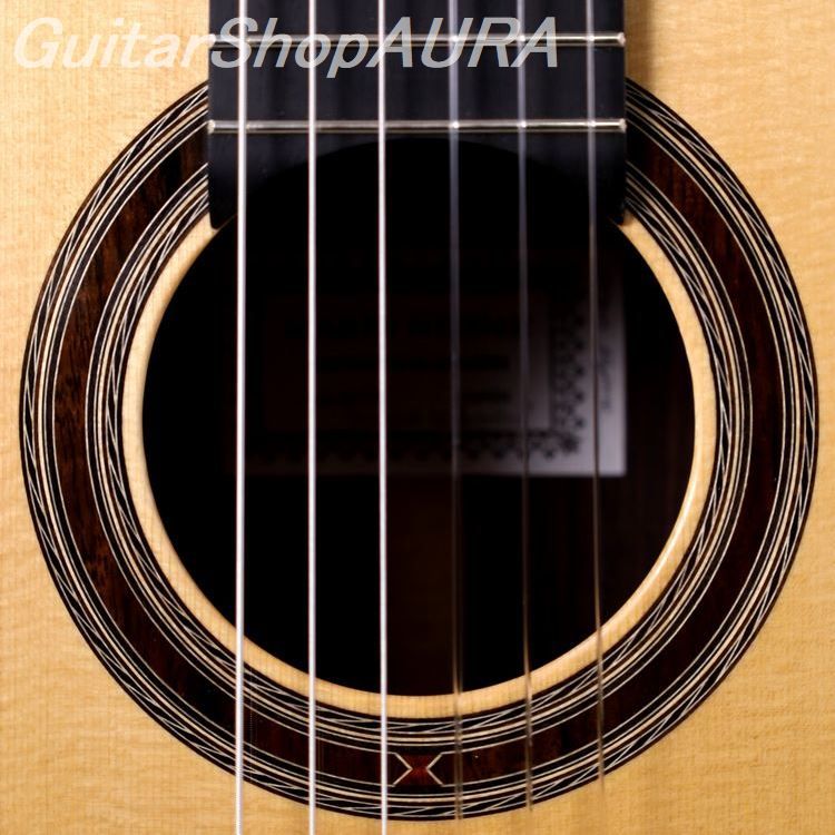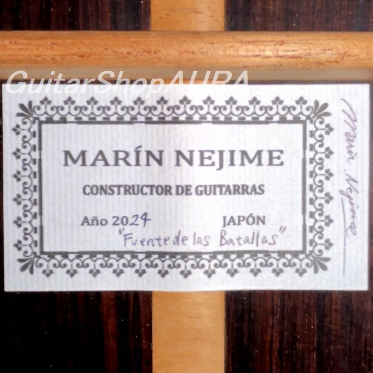 [Description] The new 2024 'Fuente de las Batallas', an original model produced by Marin Nejime, is now in stock. The name of this model on the label is the name of a magnificent and elegant fountain found in the city of Granada. Together with its previous model, 'Cuesta de Caidero', it shows respect to one of the best guitar-making cities in Spain and to his mentor Antonio Marin. In addition to the label, there is a handwritten inscription inside the body that reads 'Homenaje a Maestro Antonio Marin'. This is truly a tribute to Granada, and at the same time, a purely musical and extremely modern instrument that has been completely re-created. The original design of the rosette and bridge, which are new to this model, combine with the striking red color of the cocobolo wood on the back and sides to create a stylish look and an attractive appearance. The entire piece is finished with beautiful shellac.