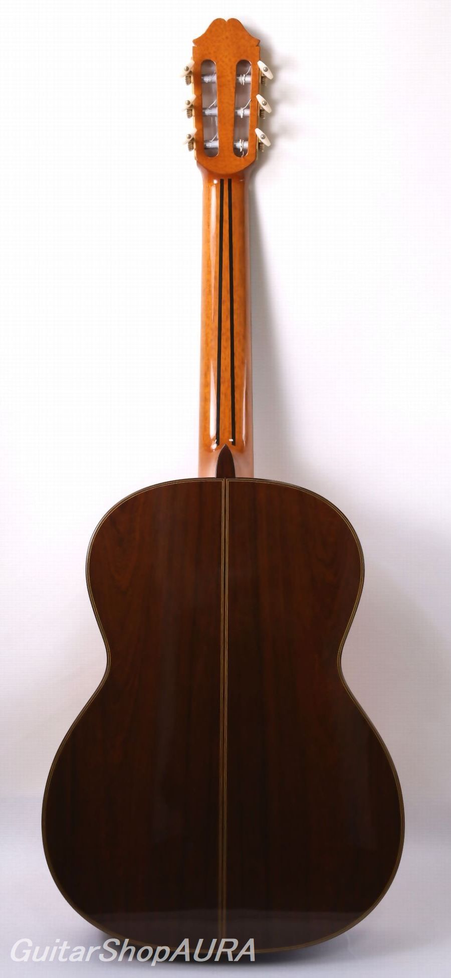 Unlike some of Sakurai’s more recent models, which use flat circular wooden discs to enhance acoustics, this guitar uses only traditional braces and bars.