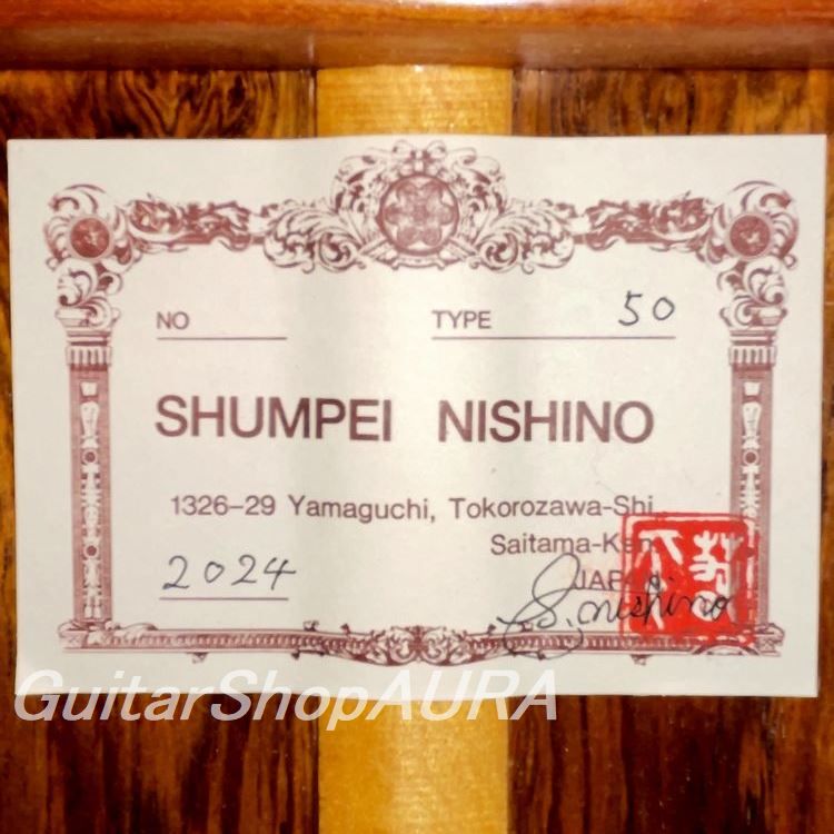 [Description] This is a Hauser model No. 50 made by Shunpei Nishino. The sound board is made of spruce, and the back and sides are made of rosewood from Central and South America. It is a model that fits Japanese tastes in every respect, and is exquisitely balanced as only a veteran maker can make it. The slightly hard sound typical of Hauser is combined with the transparency of Central and South American rosewood, resulting in a fresh sound. The acoustic balance from the rich bass to the clarity of the treble is very Hauser-like, and each note has excellent grain and separation. The expressive capacity is also excellent in a variety of ways, with sufficient amplitude and Germanic stoicism. The basic design is of course based on the "Segovia Model" by Hermann Hauser I. The strings are moderately tensioned and feel easy to play with no stress on the left hand.