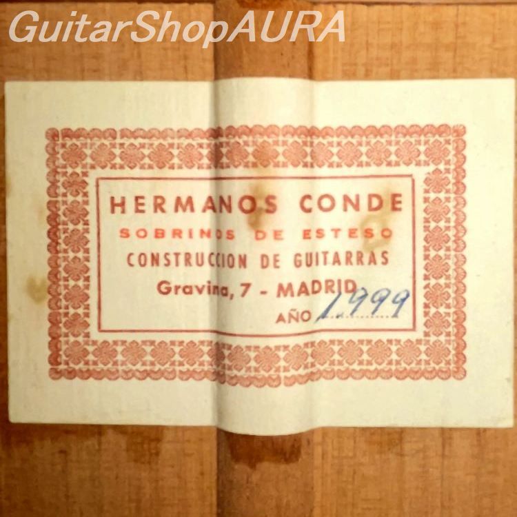 Faustino Conde (1913–1988), Esteso’s nephew and direct disciple, joined the workshop together with his brothers Mariano (1916–1989) and Julio (1918–1995). After Esteso’s death, the guitars continued to be produced under the label “Viuda y Sobrinos de Domingo Esteso” (Widow and Nephews of Domingo Esteso). Following the death of Esteso’s wife in 1959, the label was changed to “Sobrinos de Domingo Esteso / Conde Hermanos,” and from this point onward the name Conde Hermanos became firmly established as the brand identity.