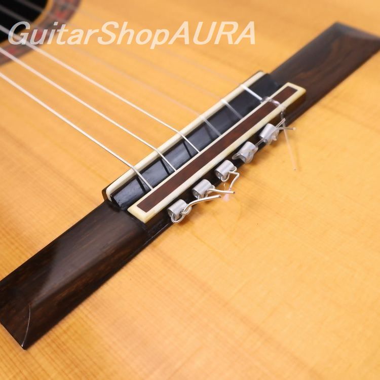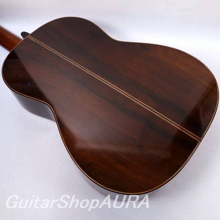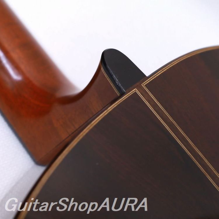 佐久間悟 製作のロマニリョスモデル 2012年製 No.39 Usedです。氏のブーシェモデルと並んで現在もカタログにラインナップされている代表モデルの一つ。その名の通りスペインの名工ホセ・ルイス・ロマニリョス(1932~2022)のギターに準拠したモデルで、その外観的特徴とされるヘッドシェイプを採用し、内部構造もロマニリョスオリジナルの設計によるものとなっています。ただしあの有名なロゼッタ(コルドバのモスク柱廊をモチーフとしたデザイン)は本器では佐久間氏オリジナルのデザインに変えられています。